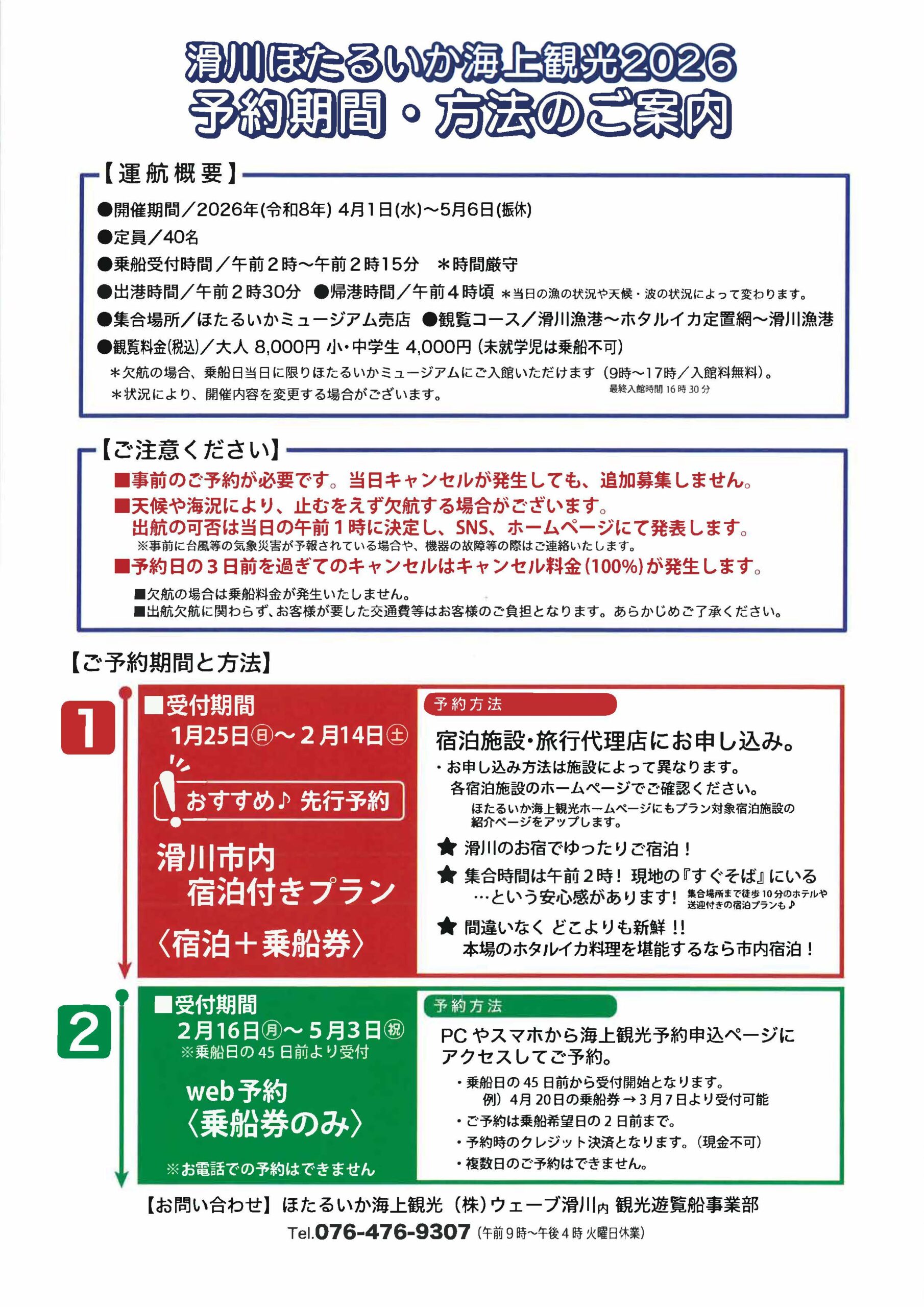 滑川ほたるいか海上観光2026について 🚢2026年の滑川ほたるいか海上観光実施について 2026年1月25日より先行予約の受付開始となります。 内容等に変更がございましたら順次更新予定となっております。 詳細な状況について必要な方は当店まで電話にて問い合わせ願います。 ほたるいか海上観光案内HPへ ほたるいか海上観光コラボプラン詳細へ